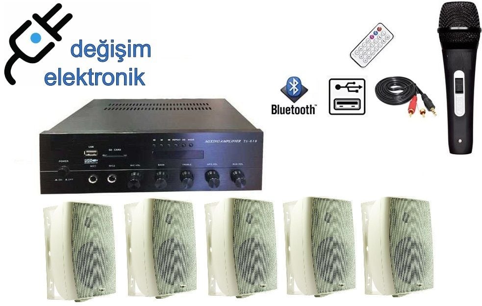 Paket içeriği; 1 Adet Anfi (2x100W Usb Bluetooth 2 Bölgeli) 5 Adet SÜTÜN-4TW Duvar Tipi Hoparlör 100 Watt