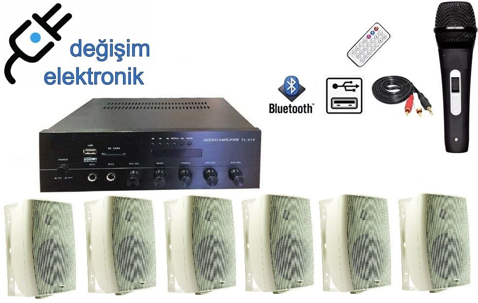 Paket içeriği; 1 Adet Anfi (2x100W Usb Bluetooth 2 Bölgeli) 6 Adet SÜTÜN-4TW Duvar Tipi Hoparlör 100 Watt